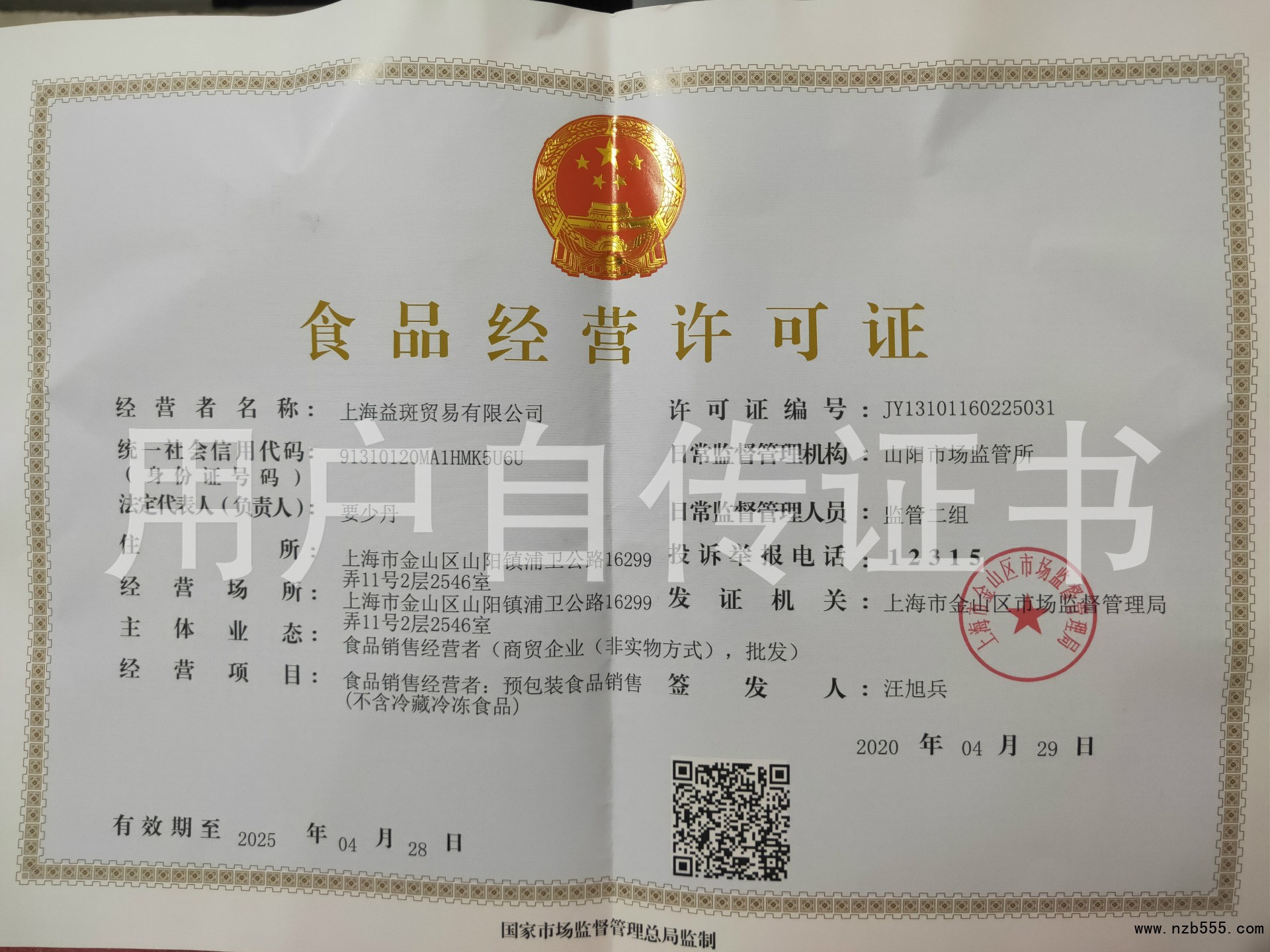 | 發(fā)證機(jī)構(gòu): | 上海市金山區(qū)市場(chǎng)監(jiān)督管理局 | 發(fā)證時(shí)間 : | 2020-04-29 |