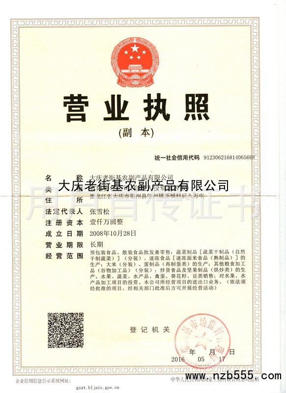 發證機構:   肇州縣市場監督管理局 發證時間 :   2016-05-17