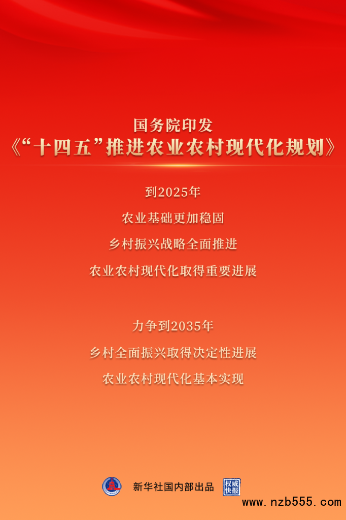 農(nóng)業(yè)農(nóng)村部副部長鄧小剛表示,推進農(nóng)業(yè)農(nóng)村現(xiàn)代化是全面建設(shè)社會主義現(xiàn)代化國家的重大任務(wù)。《“十四五”推進農(nóng)業(yè)農(nóng)村現(xiàn)代化規(guī)劃》提出,通過五年的努力,到2025年,農(nóng)業(yè)基礎(chǔ)更加穩(wěn)固,鄉(xiāng)村振興戰(zhàn)略全面推進,農(nóng)業(yè)農(nóng)村現(xiàn)代化取得重要進展。梯次推進有條件的地區(qū)率先基本實現(xiàn)農(nóng)業(yè)農(nóng)村現(xiàn)代化,脫貧地區(qū)實現(xiàn)鞏固拓展脫貧攻堅成果同鄉(xiāng)村振興有效銜接。力爭到2035年,鄉(xiāng)村全面振興取得決定性進展,農(nóng)業(yè)農(nóng)村現(xiàn)代化基本實現(xiàn)。